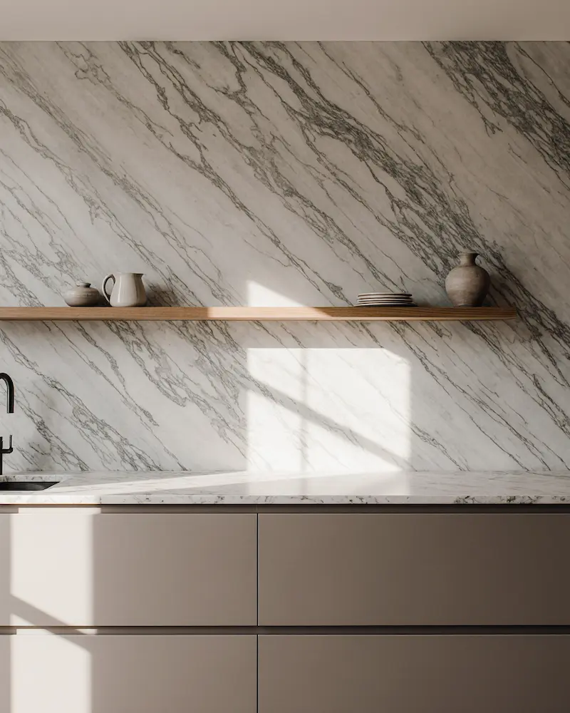 I saw a kitchen recently that had marble running up from the countertop to the ceiling—no upper cabinets, just stone and open shelves. It looked like art. Bonus? Way easier to clean. I mean, who has time to scrub grout lines?